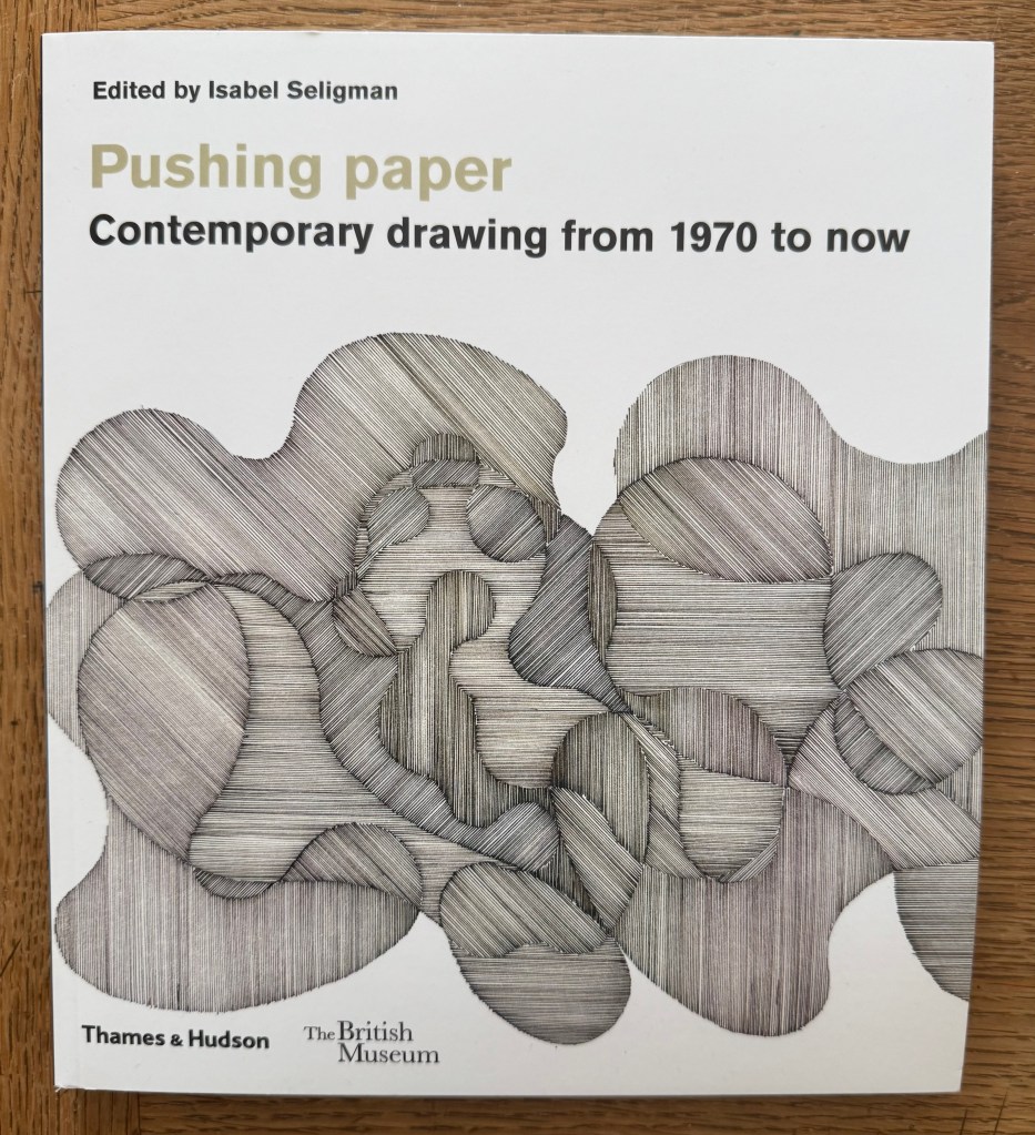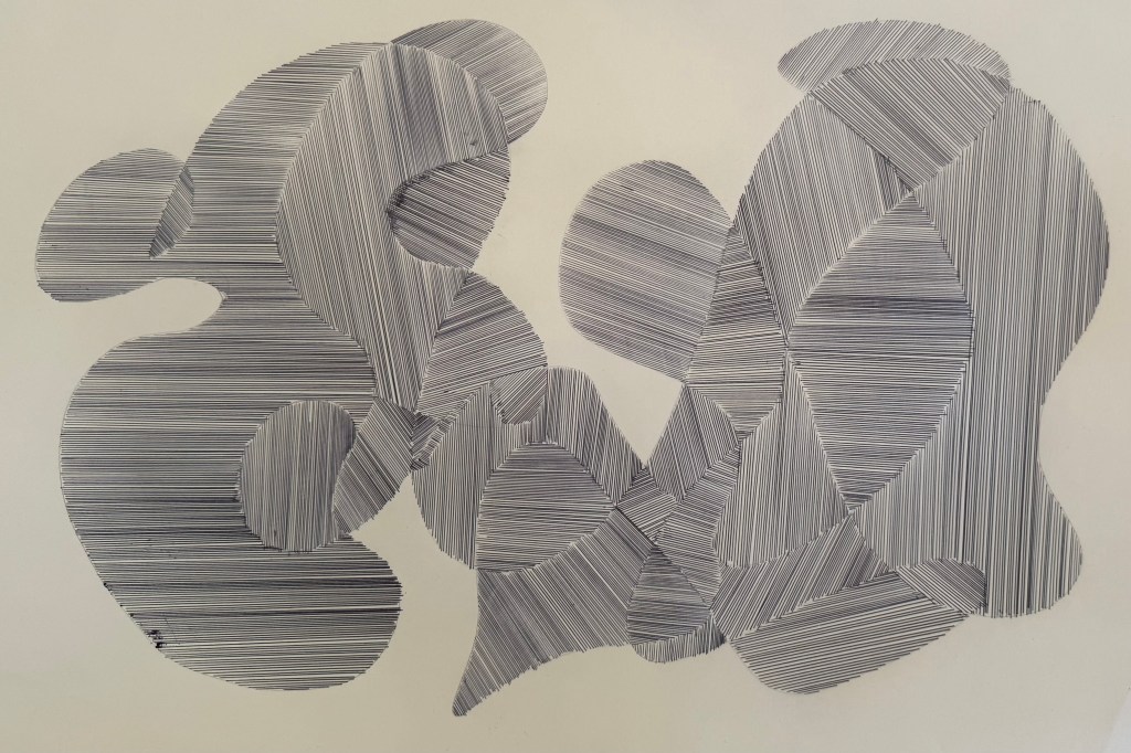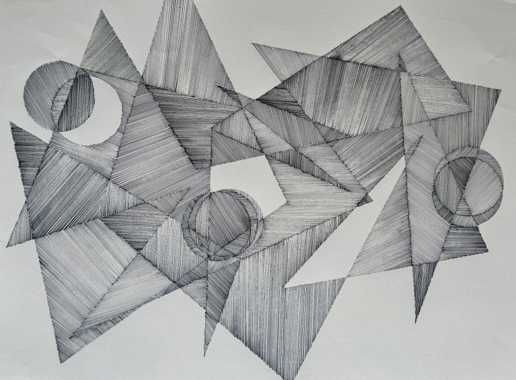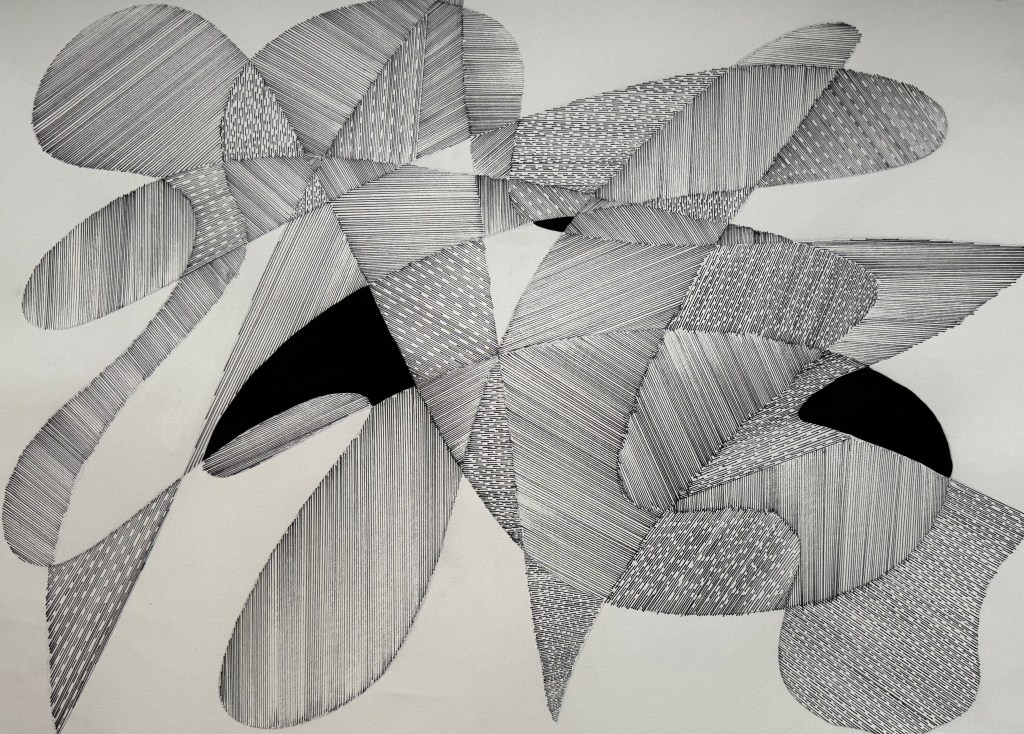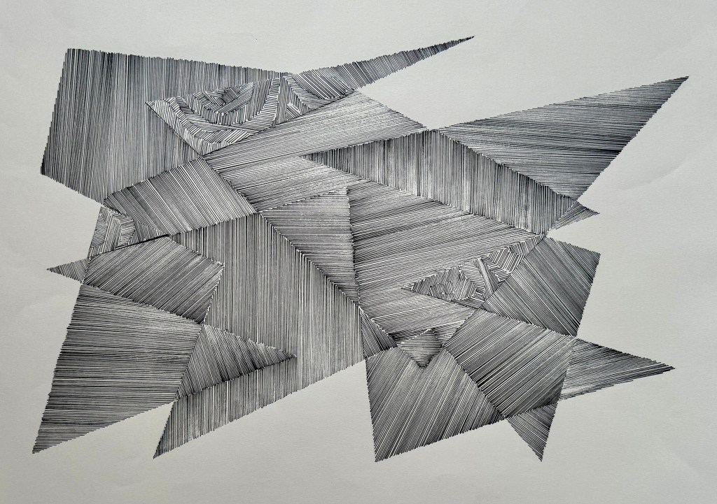 Next, I decided to try lines and I used the same pen throughout (0.8mm). I incorporated a collage element in some of the sections – cut outs from some contour work – which I think creates an effective contrast. There’s a strong sense of something having been folded, creating numerous different planes – almost like origami. The collages areas remind me of chipboard.