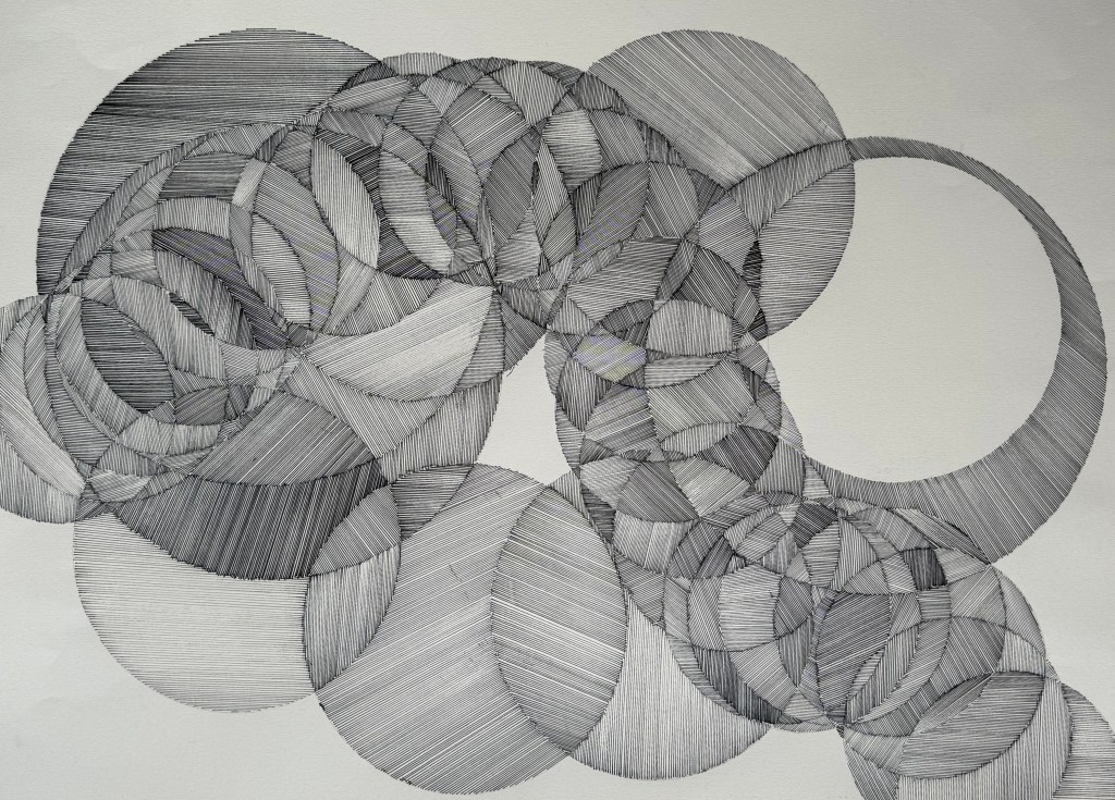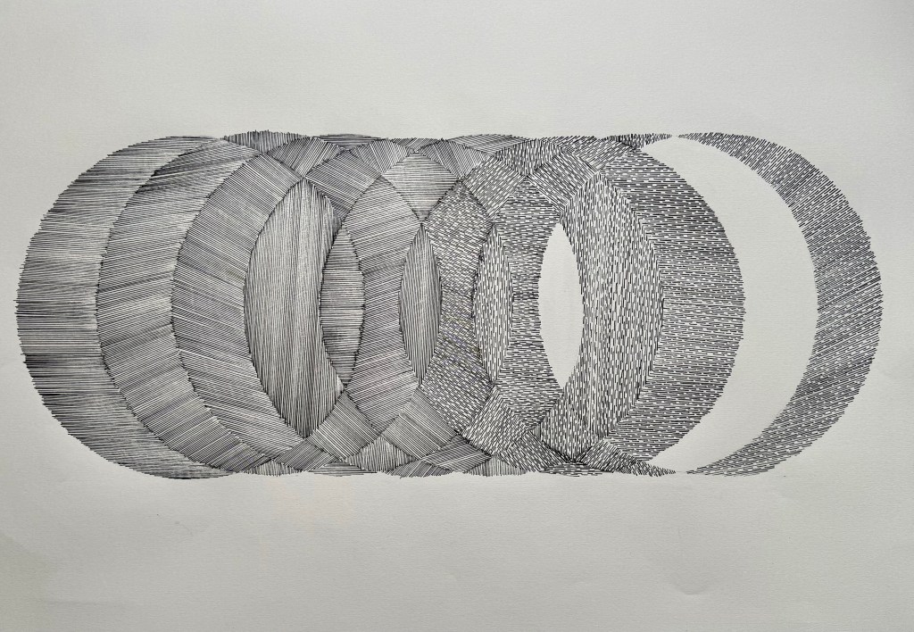 And then the wheels fell off, when I realised that I hadn’t thought about using different widths of pen, but keeping the lines in the same direction. I used a series of overlapping circles and filled in the sections within each circle in the same direction.