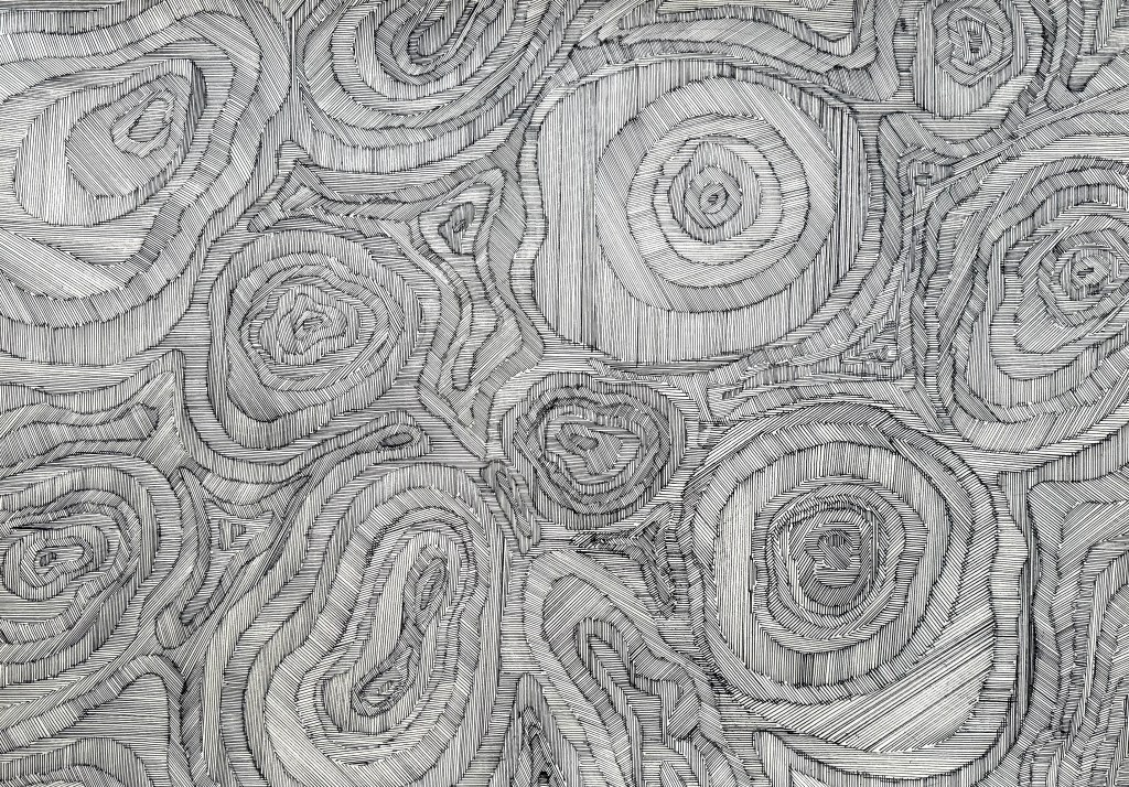 I really like the effect created using the contour lines. Some parts feel almost three dimensional. My system of working was a bit more regimented this time – I used a variety of different pen widths, using the same width and drawing in the same direction for each of the separate contours. It creates something quite textural, almost woven.