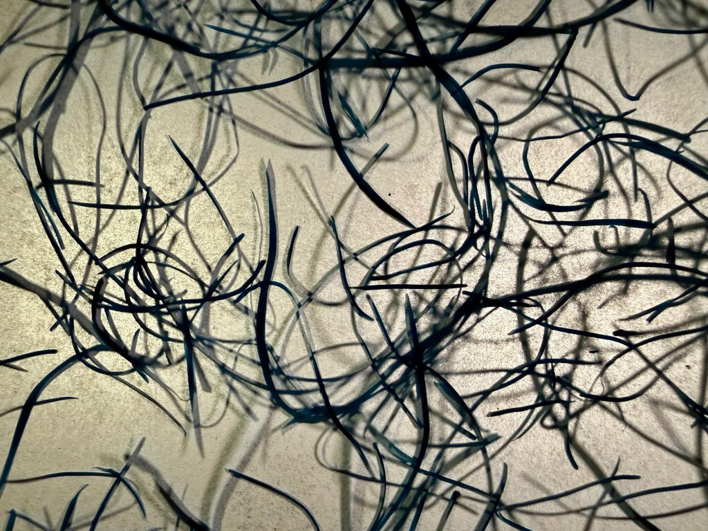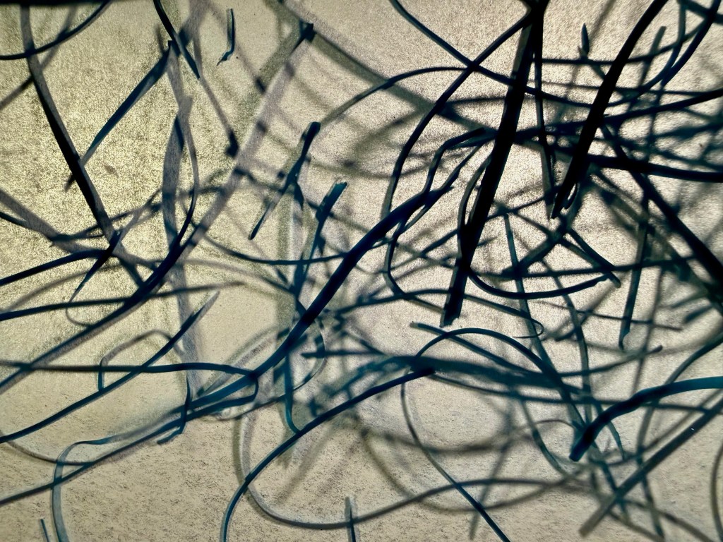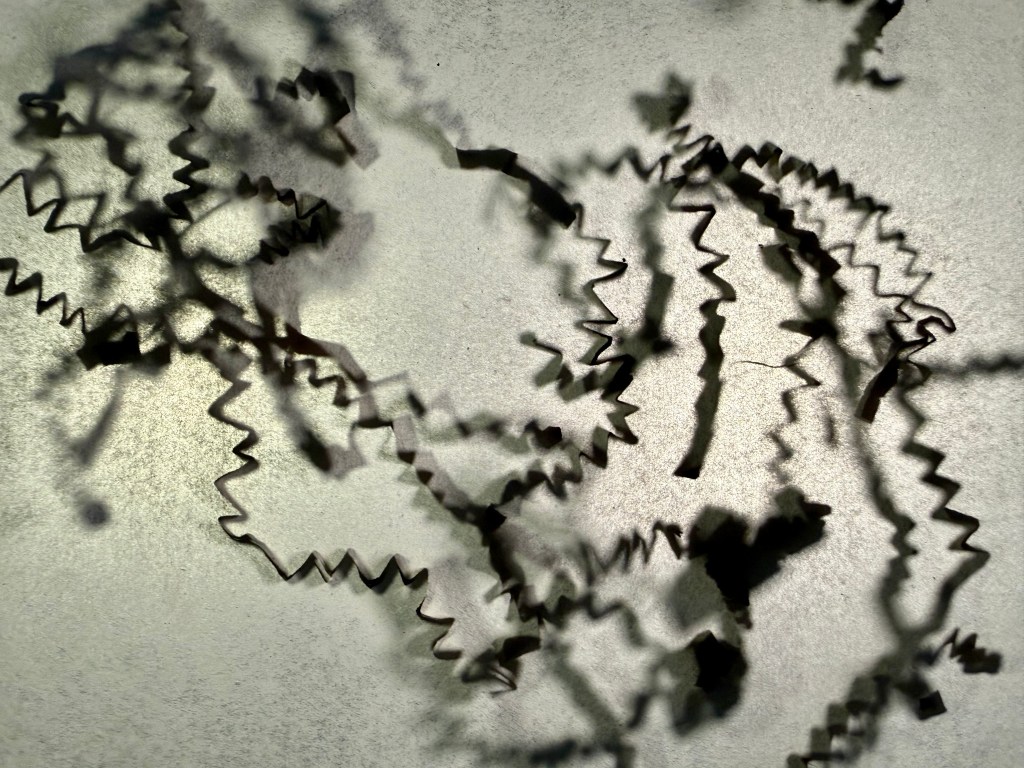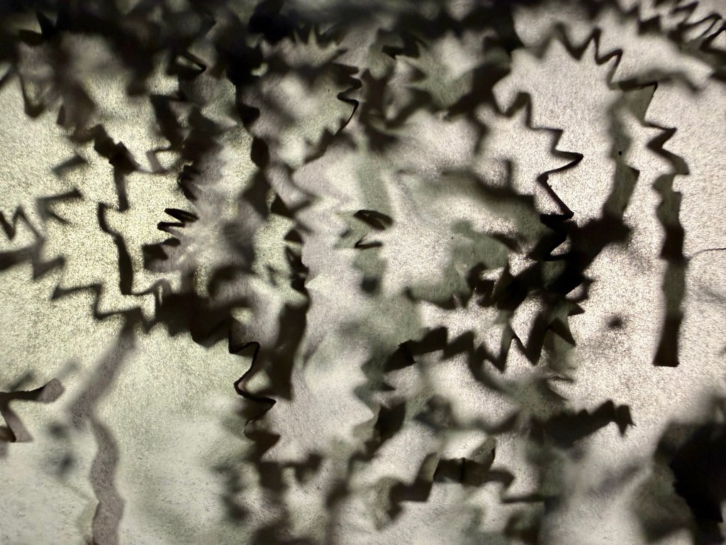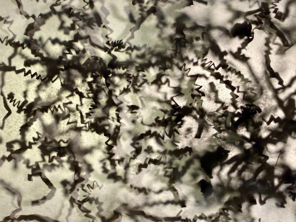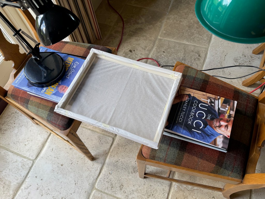 I was cutting some lino yesterday and I collected the bits of lino on a piece of tissue paper. As I was lifting it up to dispose of them I thought, ‘oh that looks interesting’. And off I went. I wrapped some tissue paper around an old photo frame. I couldn’t be botherered to go off and find clamps etc so I balanced the frame on some books on two chairs. I then set up a couple of anglepoise lamps. Lying flat on my back on the kitchen floor allowed me to photograph the tissue paper from underneath. I experimented with the lino bits as well as some packaging which I had saved, just in case it might come in useful.