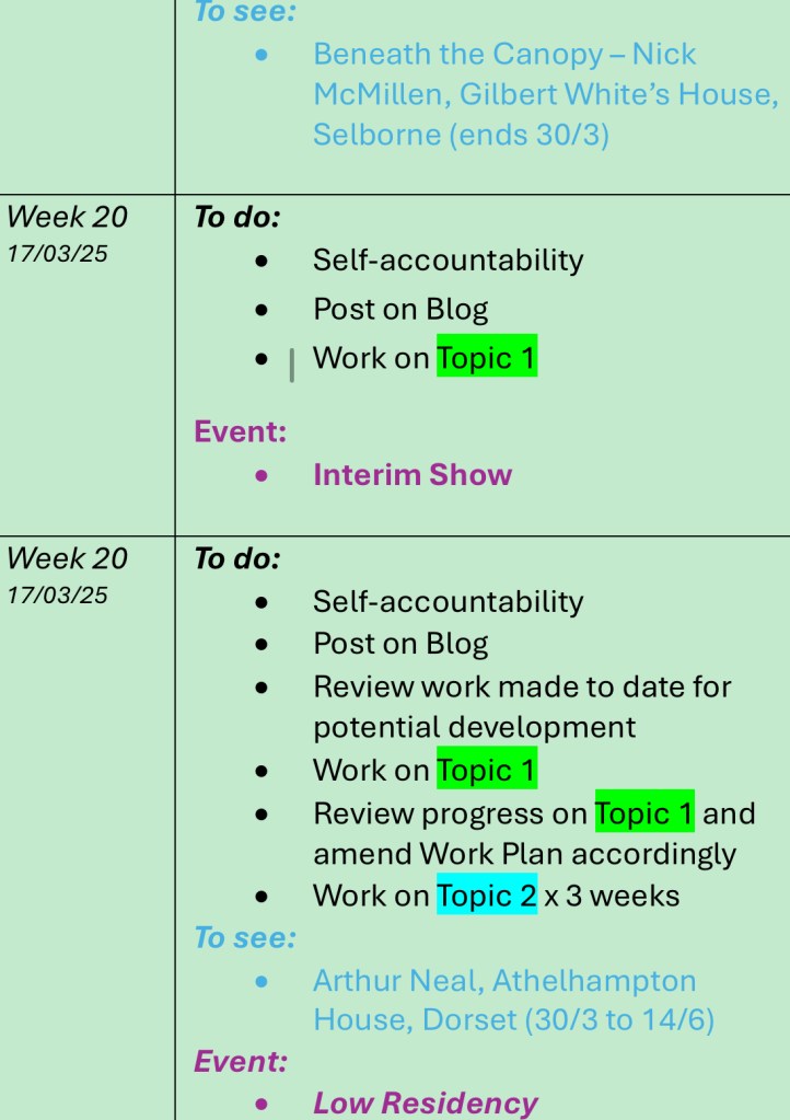 I have also resolved to scrap my work plan in so far as I have sought to set myself on a prescriptive path; I will work on whatever interests me when I wake up in the morning. In my work plan I have also attempted to impose a way of working which really isn’t who I am. I’m trying to force myself into a pigeon-hole which isn’t my shape; to have some self-discipline, which frankly I don’t have. I work to deadlines, although just recently I haven’t left things to the last minute, which has been a huge change in me. I completed my Study Statement and Unit 1 Assessment leaving myself plenty of time to review and reflect. I also recognise that I don’t have a constant rhythm of working; I have periods of intense activity and then I reward myself with a period of doing nothing, although I am – I’m thinking and processing and doing other activities such as reading and looking at art, which are equally as valuable.