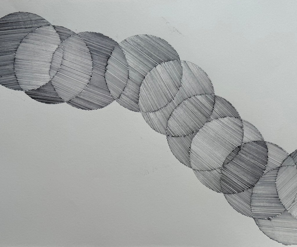 And then the wheels fell off, when I realised that I hadn’t thought about using different widths of pen, but keeping the lines in the same direction. I used a series of overlapping circles and filled in the sections within each circle in the same direction.