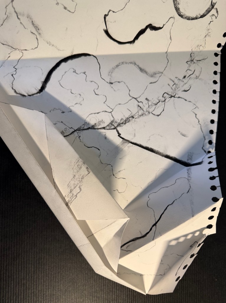 During the session we were instructed to make marks and to think about the context of our practice whilst doing it. We were then paired up and gave each other instructions as to how to make further marks with a view to giving up control, something that I’ve been exploring myself recently. I was instructed to keep my charcoal on the paper and to vary the pressure. We then folded and creased our paper, again taking instructions for a second round of folding – fold an edge as if wrapping a present. This reminded me of our workshop with Christian Azolan in last year’s Low Res – I love how folding and unfolded adds a different dimension, creates shadows, particularly where I had torn the page from my sketchbook.