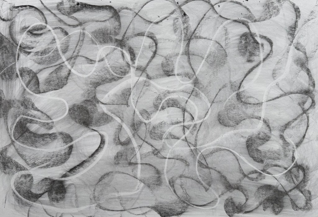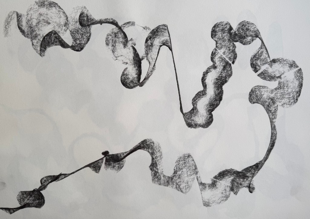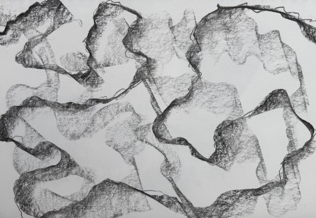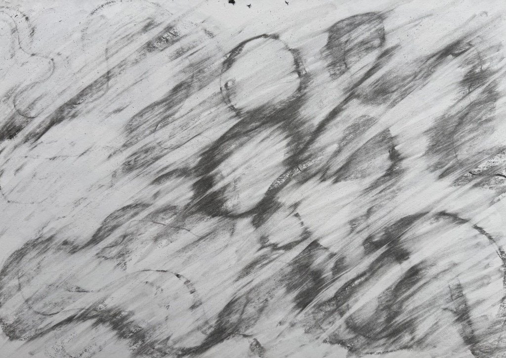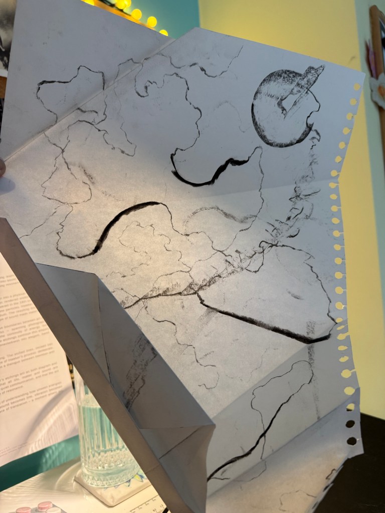 We took photographs of our piece and uploaded it to the miro board, giving it a title, taking it in turns to talk about it with the rest of the group. I called mine ‘Process’ because it evidenced my process – you can see where I exerted different pressure as I made my marks, how where I folded the paper the charcoal was smudged by my finger and the charcoal left a ghostly print on the opposite part of the paper.
