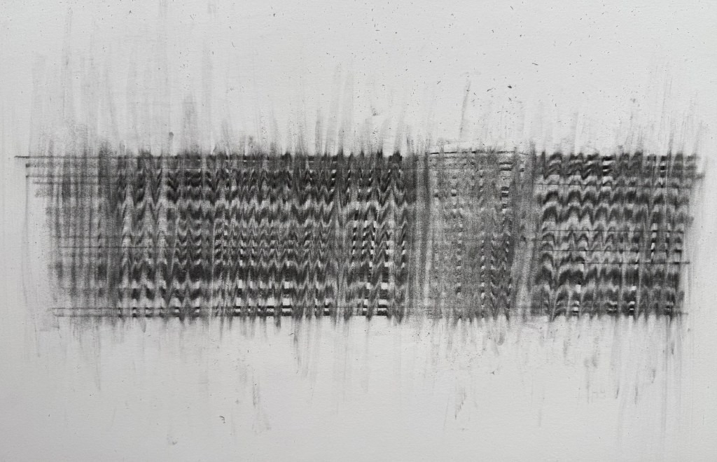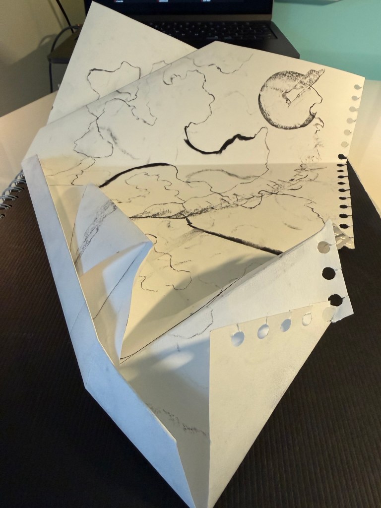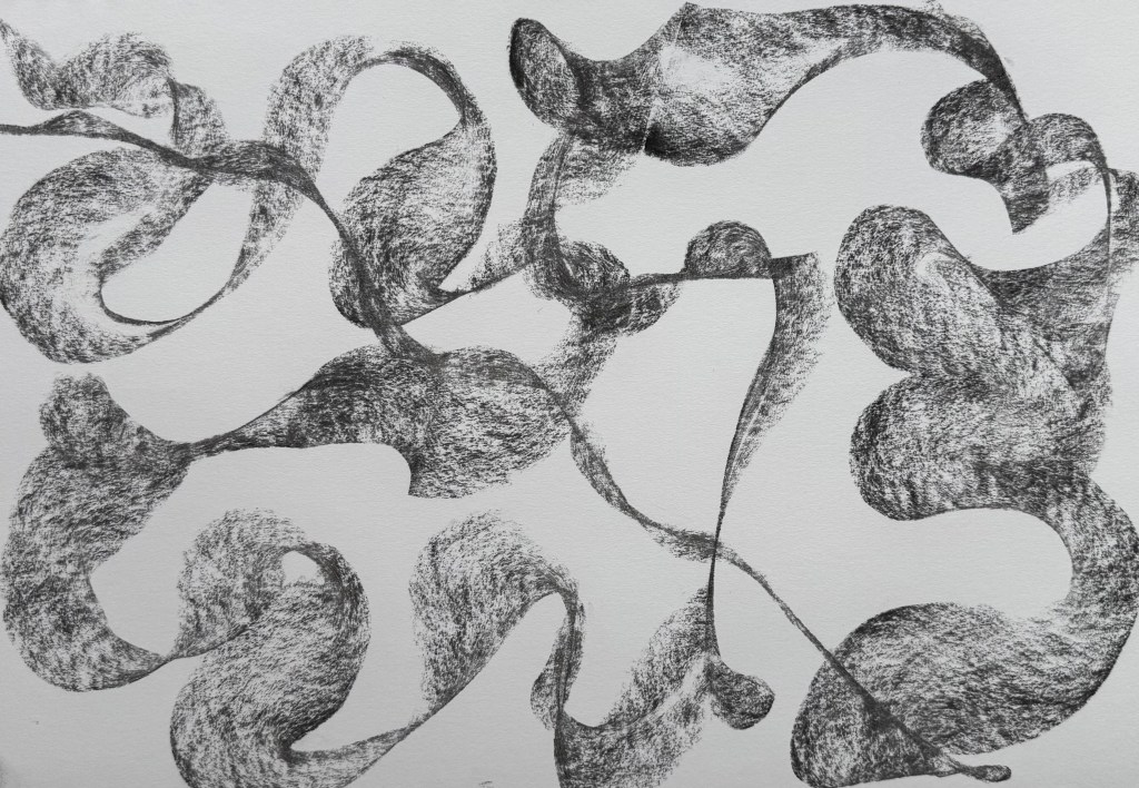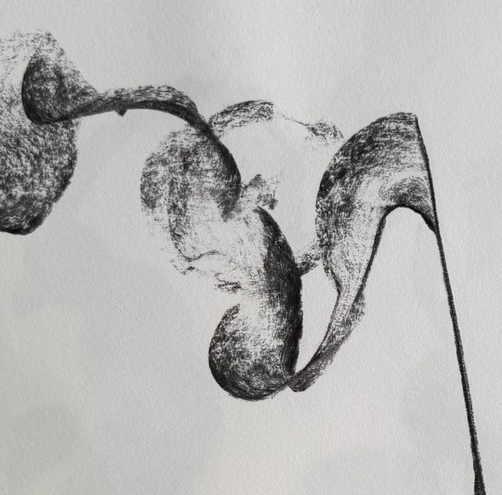 We took photographs of our piece and uploaded it to the miro board, giving it a title, taking it in turns to talk about it with the rest of the group. I called mine ‘Process’ because it evidenced my process – you can see where I exerted different pressure as I made my marks, how where I folded the paper the charcoal was smudged by my finger and the charcoal left a ghostly print on the opposite part of the paper.