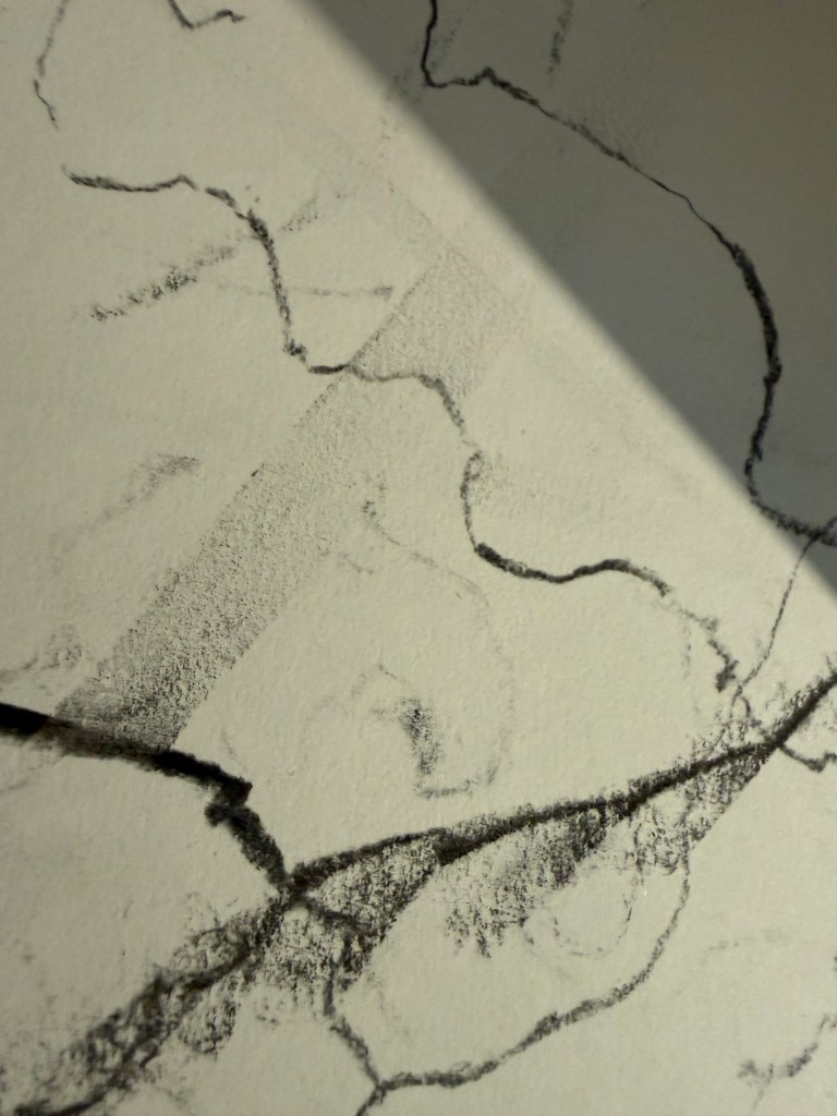 I really enjoy using the charcoal on its side, moving it up and down and rotating it on itself. I used a thick stick as well as a thin stick of willow charcoal. Because I was able to press down harder on the thicker stick I managed to achieve a greater range of tone.