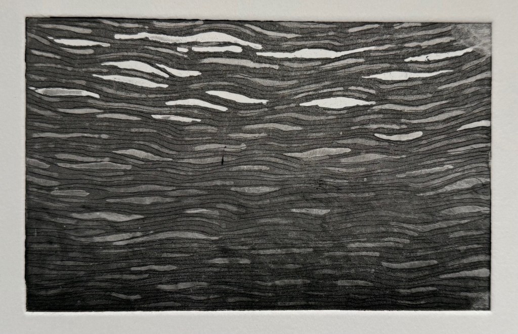 And then Paul mentioned the word ‘aquatint’. I had trouble with it last year – working out what was going on. I understood it a bit better this time, but I don’t think that my image was best suited to it. At times the fine lines disappeared and I was left with blocks of tone, and even Paul’s suggestion to use extender didn’t really make it any better. A bit of creativity in the inking up process just about had me feeling ok about it. This is probably the best one.