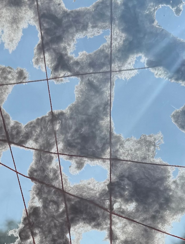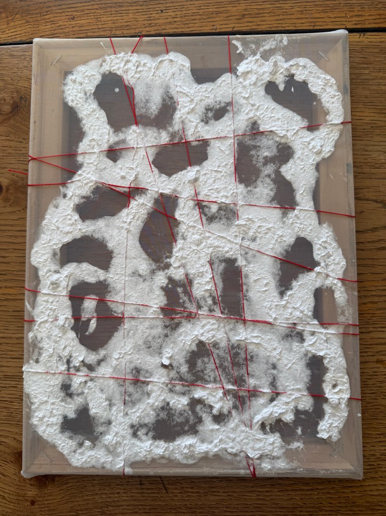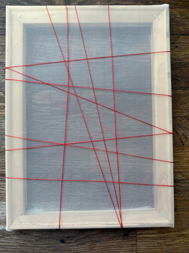 I made a mould out of some stretcher bars and some mesh, wrapped some thread around it and then squirted on the paper pulp. Removing it from the mould when it was dry was satisfying.