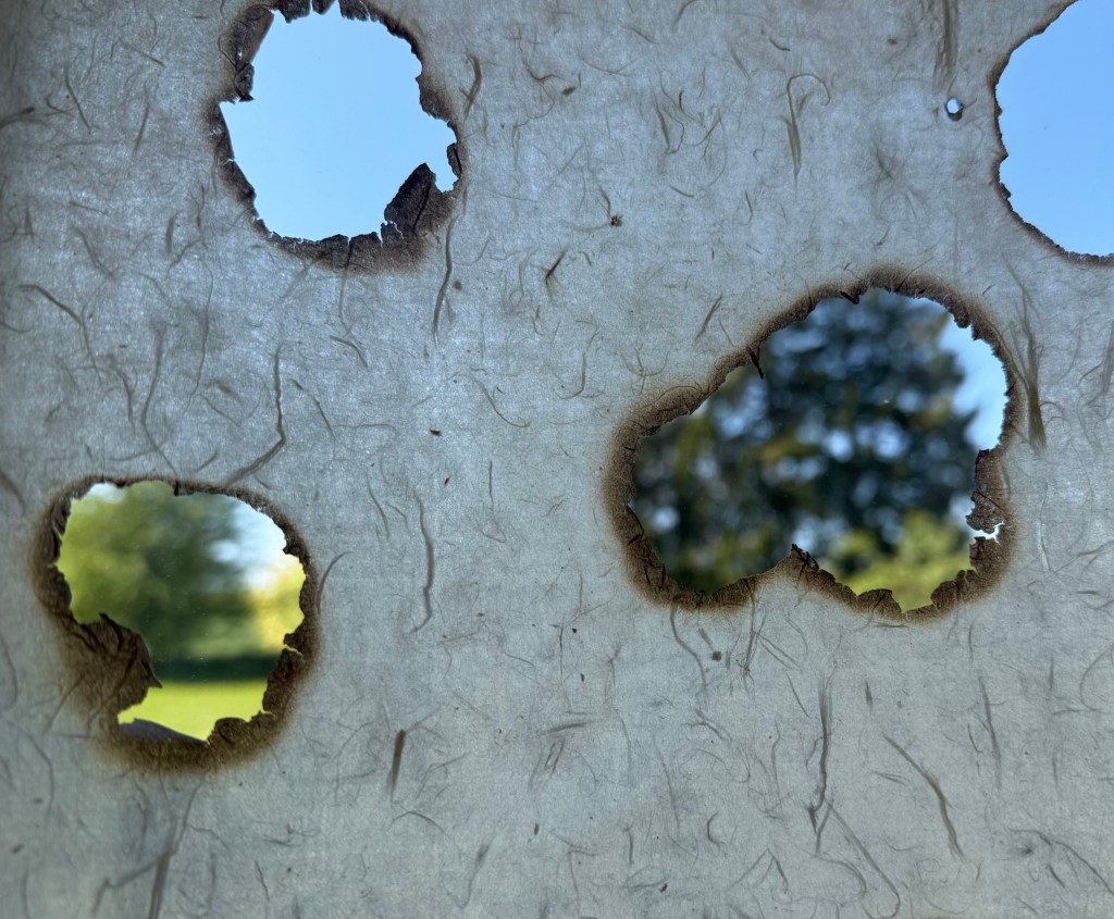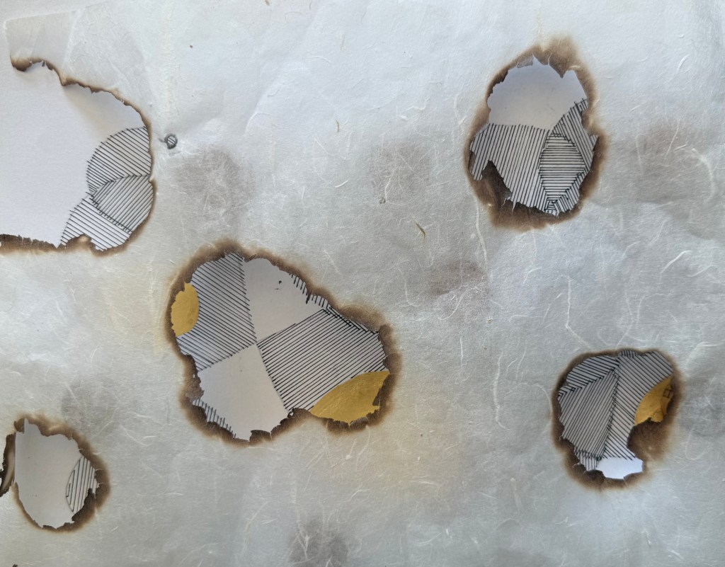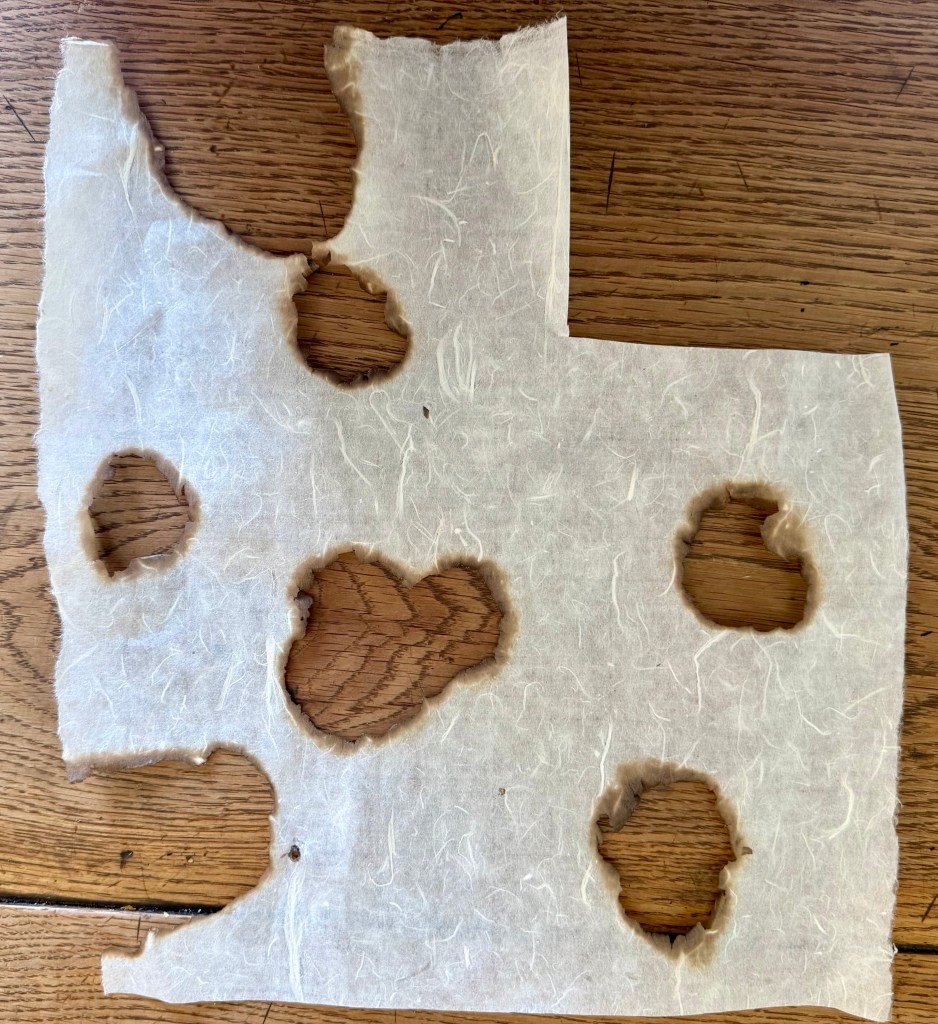 I’ve been thinking about layers again. I want to make a layered piece but I need to experiment with combinations. I’ve been meaning to have a go at making paper by squirting paper pulp. I used an old Nurofen syringe, but had to make the hole a bit bigger because the pulp kept on clogging it. I used a hot skewer to make it bigger, but while I had the lighter I decided to burn some holes in some of the mulberry paper I’ve been using to make book cloth.