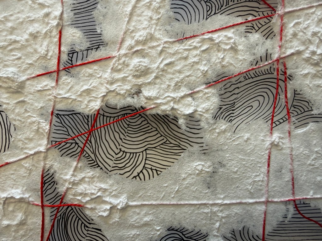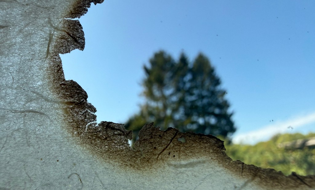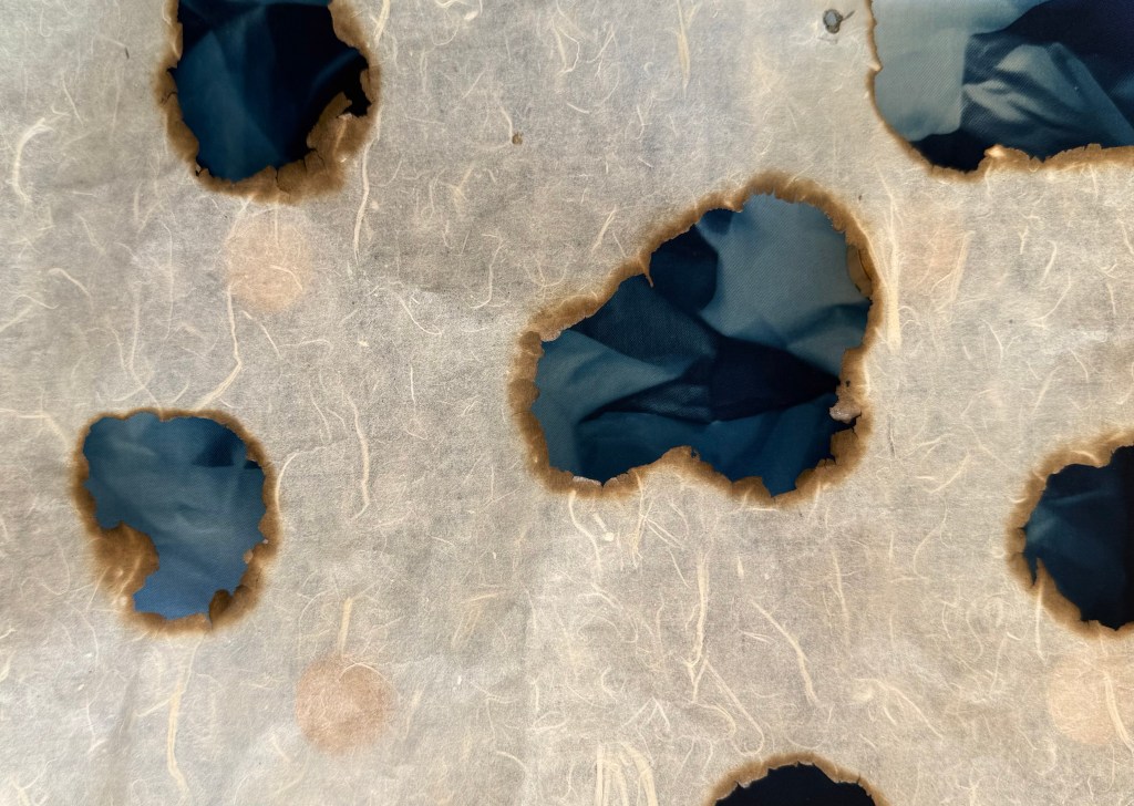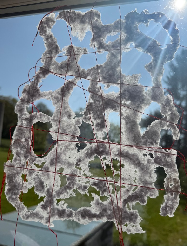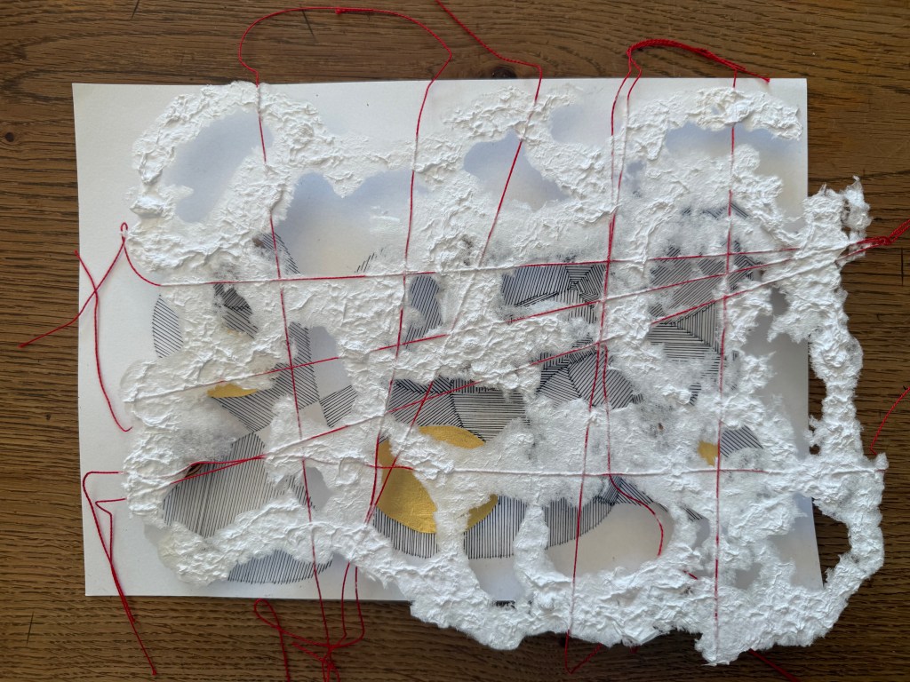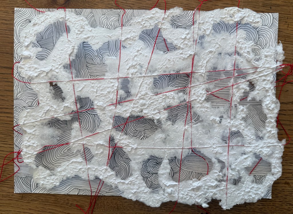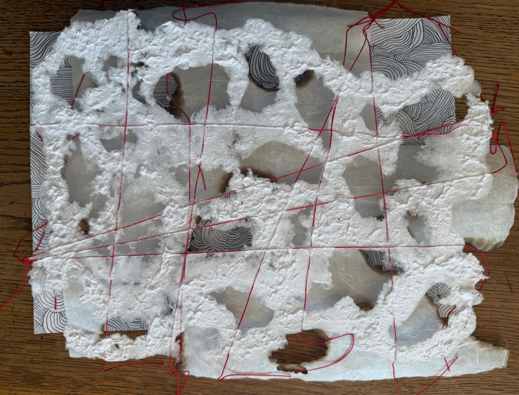 It was a really interesting exercise. I find myself drawn more towards the burnt paper than the thread and paper pulp. Maybe I need to try the paper pulp on different images, but my initial thought is that I don’t like the combination with the thread, although the thread does allow it to be suspended, rather than lying flat. I think that I much prefer it when I made the paper with the thread embroidery in a whole sheet. The paper pulp might look better without the thread, with the thread incorporated into a different layer.
