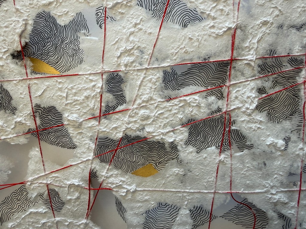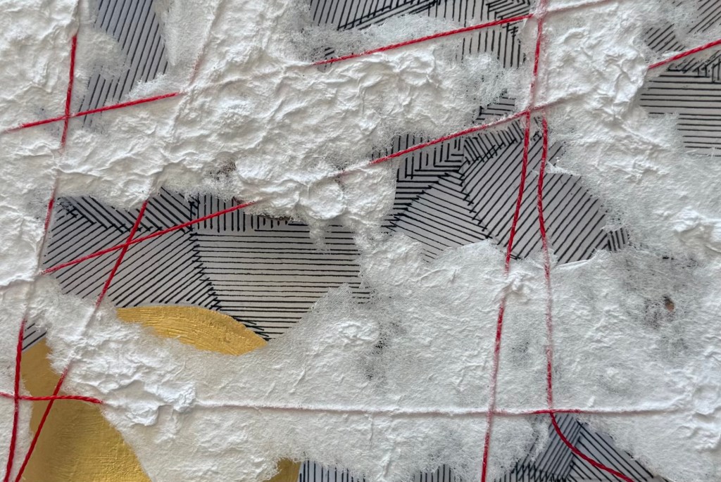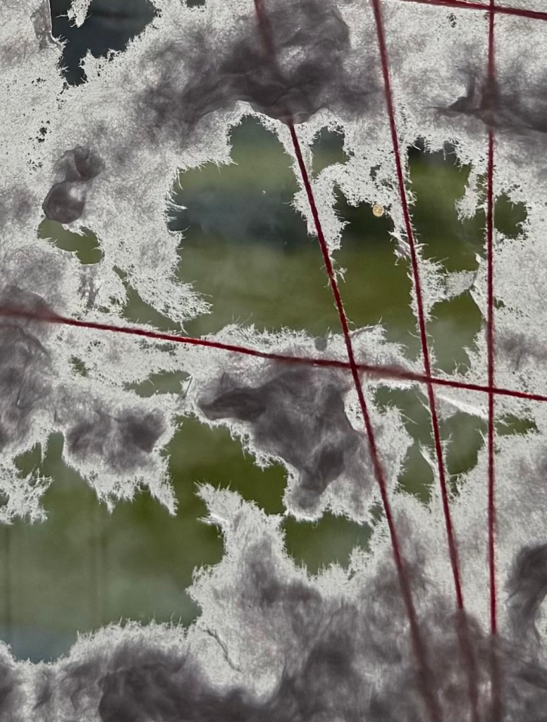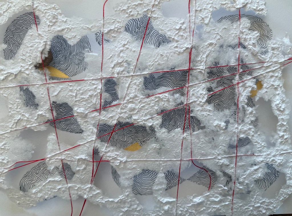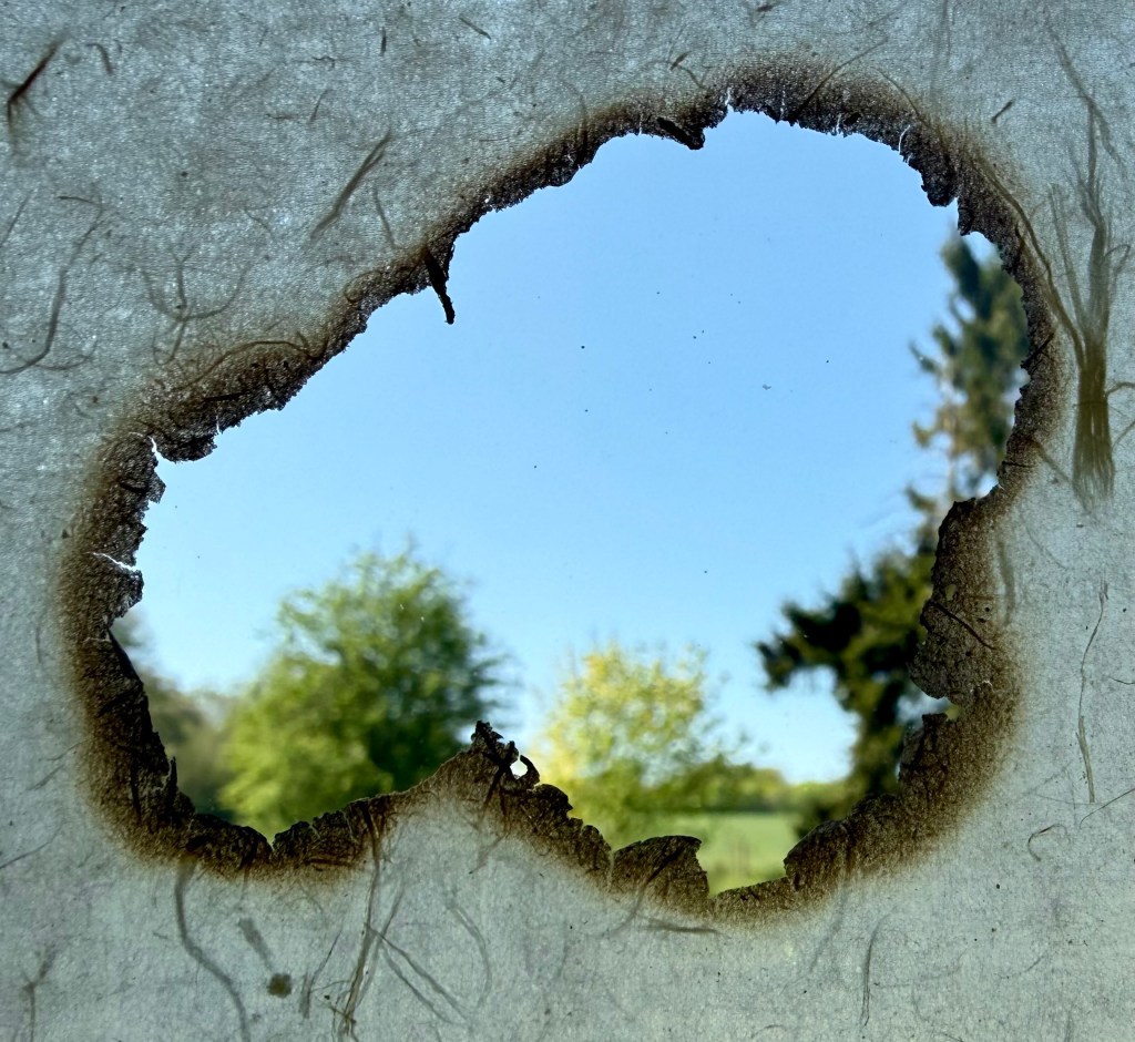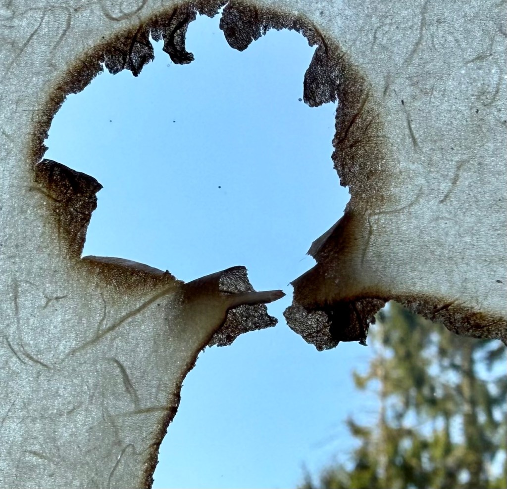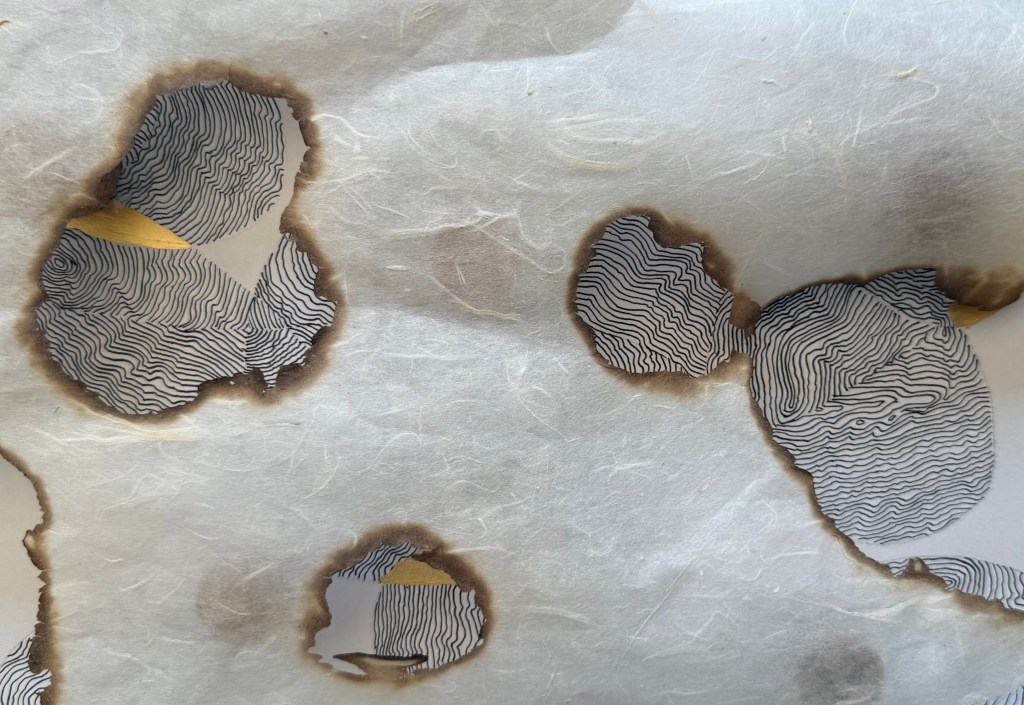It was a really interesting exercise. I find myself drawn more towards the burnt paper than the thread and paper pulp. Maybe I need to try the paper pulp on different images, but my initial thought is that I don’t like the combination with the thread, although the thread does allow it to be suspended, rather than lying flat. I think that I much prefer it when I made the paper with the thread embroidery in a whole sheet. The paper pulp might look better without the thread, with the thread incorporated into a different layer.