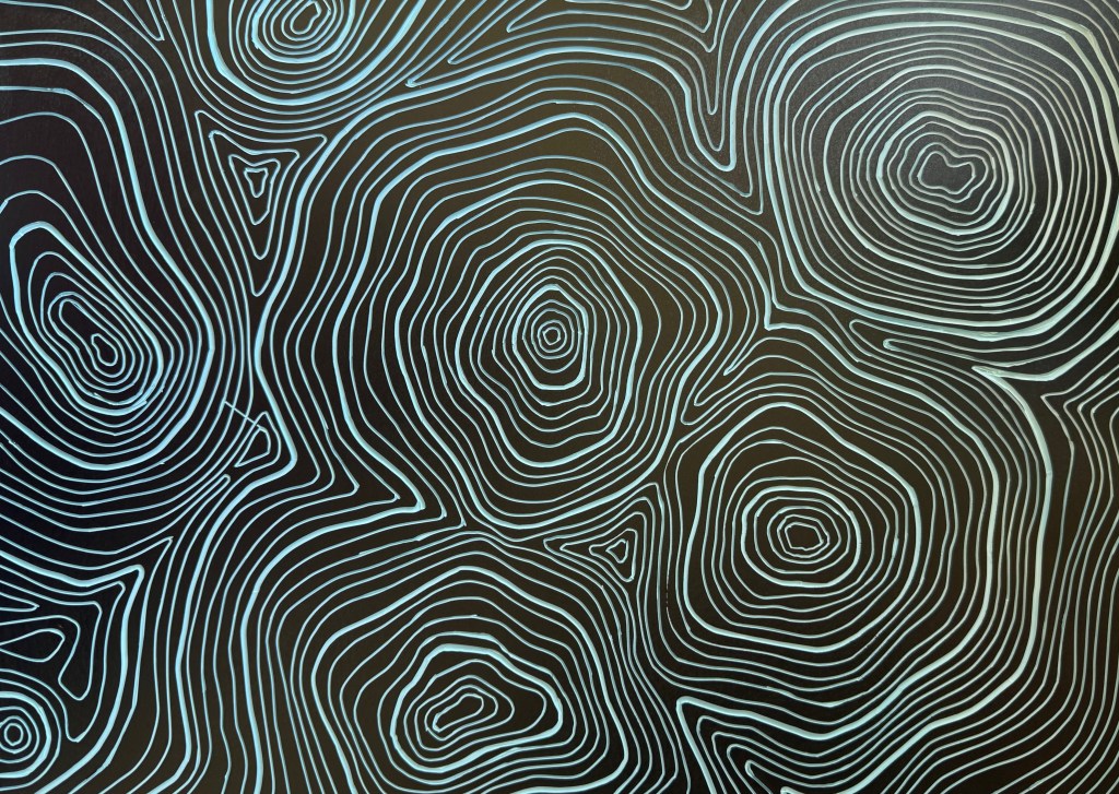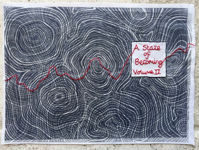 Fabrics bonded together and backed with mulberry paper and addition of title.