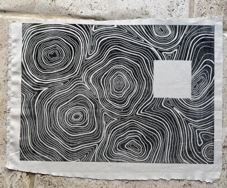 I’ve been making the book cloth for the second book. This time I lino printed onto a sheer fabric and a plain cotton.