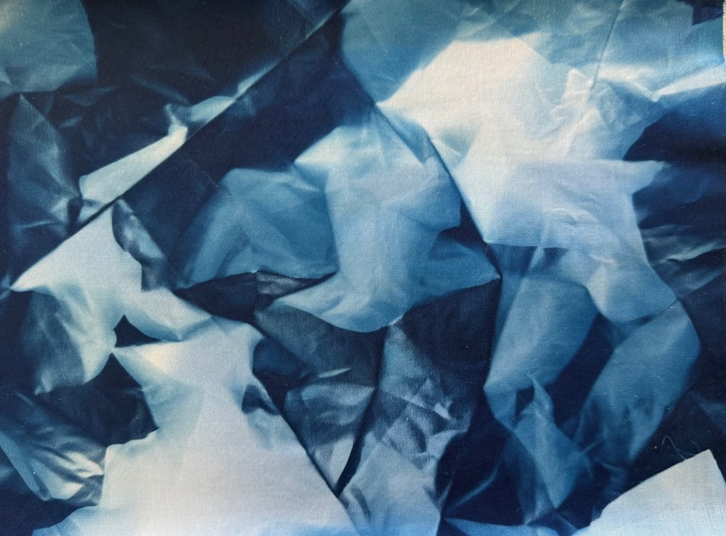 I then redid the cyantotype for the remake of volume I. Whilst I was waiting for it to develop, I scrunched a piece of fabric up and left it outside. I was pleasantly surprised by the result.