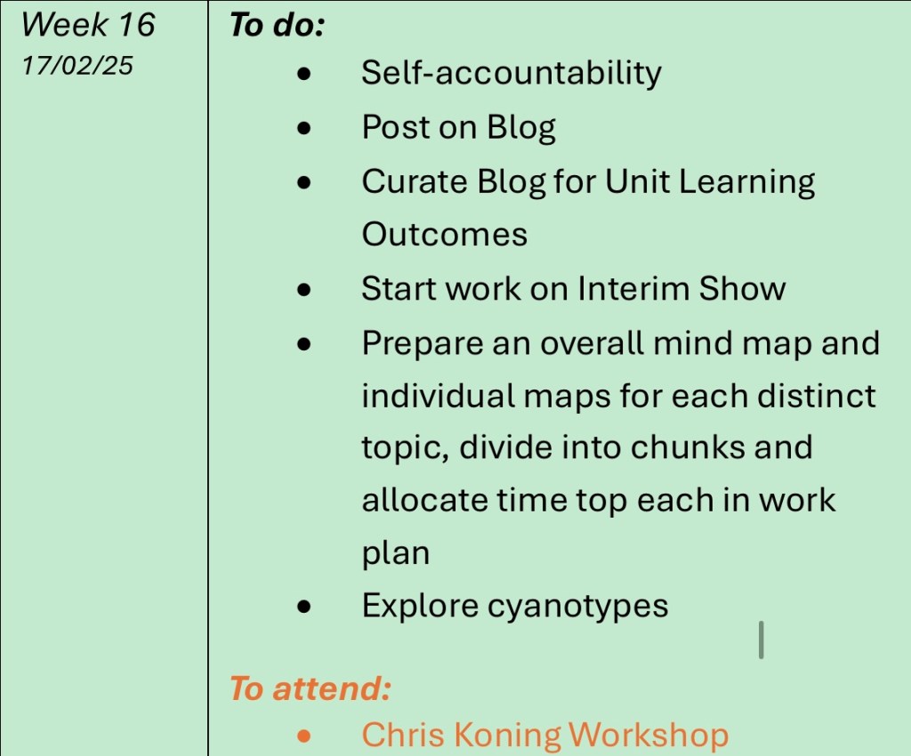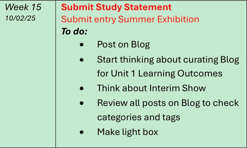 I have also resolved to scrap my work plan in so far as I have sought to set myself on a prescriptive path; I will work on whatever interests me when I wake up in the morning. In my work plan I have also attempted to impose a way of working which really isn’t who I am. I’m trying to force myself into a pigeon-hole which isn’t my shape; to have some self-discipline, which frankly I don’t have. I work to deadlines, although just recently I haven’t left things to the last minute, which has been a huge change in me. I completed my Study Statement and Unit 1 Assessment leaving myself plenty of time to review and reflect. I also recognise that I don’t have a constant rhythm of working; I have periods of intense activity and then I reward myself with a period of doing nothing, although I am – I’m thinking and processing and doing other activities such as reading and looking at art, which are equally as valuable.
