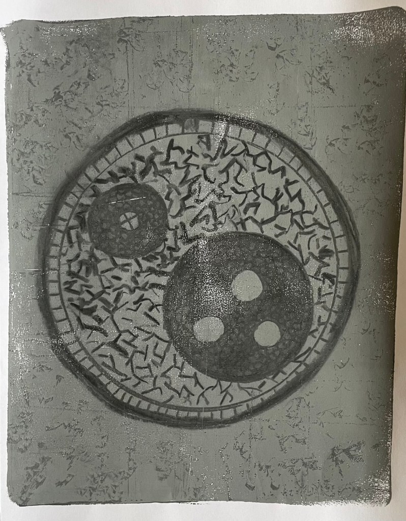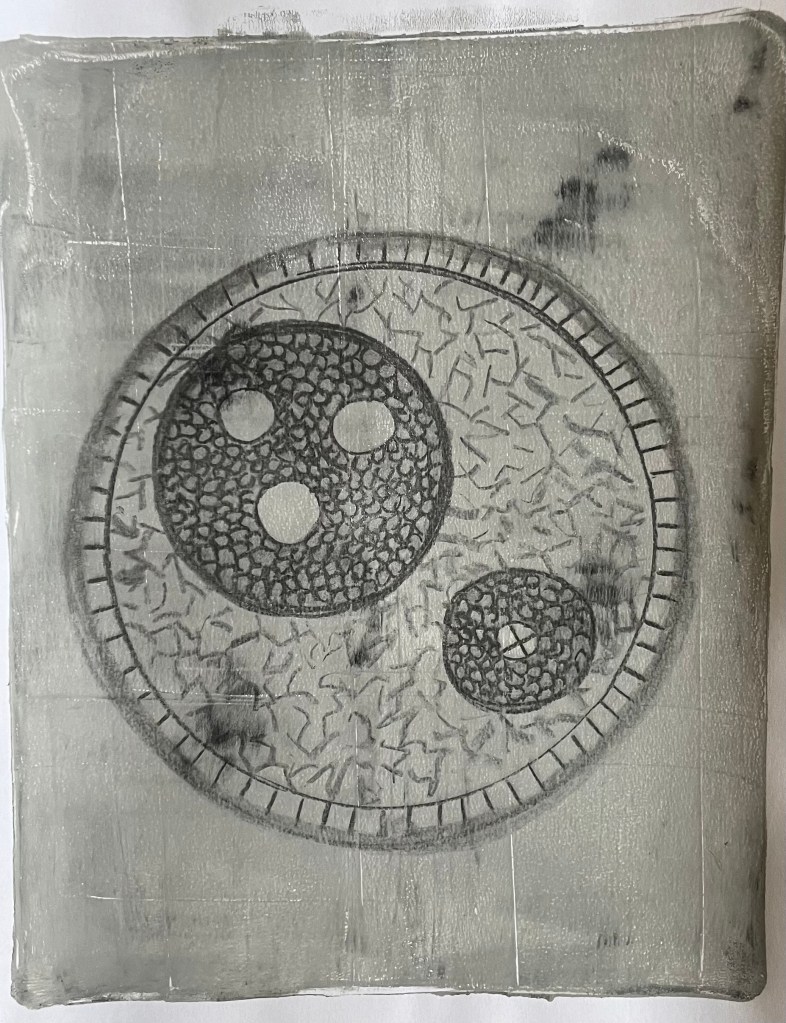 I explained the process of making the pieces and how they seemed to develop into a type of map. I mentioned that the subject of maps has come to the forefront of my thinking recently along with the idea of connection. In my Unit 1 feedback one of the comments was: “It feels as though you have been working through an abundance of techniques that are maybe a type of mapping – now is the time to compare and contrast all of those experiments in order to develop an intuitive and personal way of mapping your experiences…”.