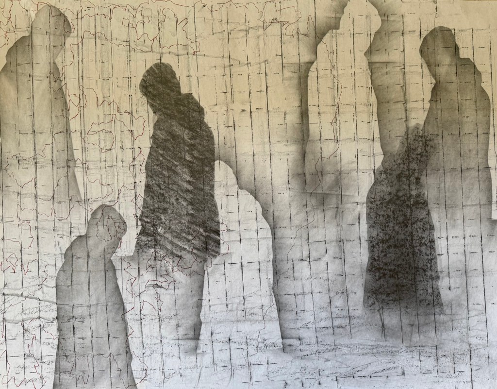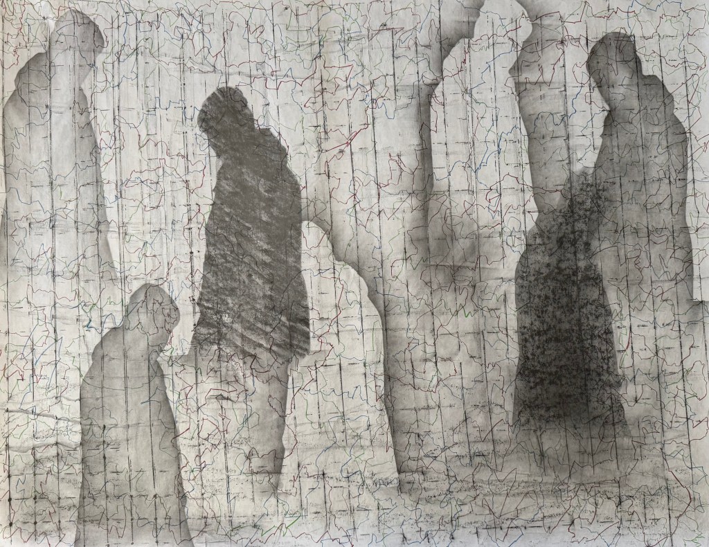 Cheng commented that the white shapes give the impression of something that is no longer there and the dark shapes are reminiscent of shadows. Thinking about it, the shadows are cast by something that is there but is not visible. A figure’s absence is felt yet we feel a figure’s presence somewhere – it just about sums up ancestry.