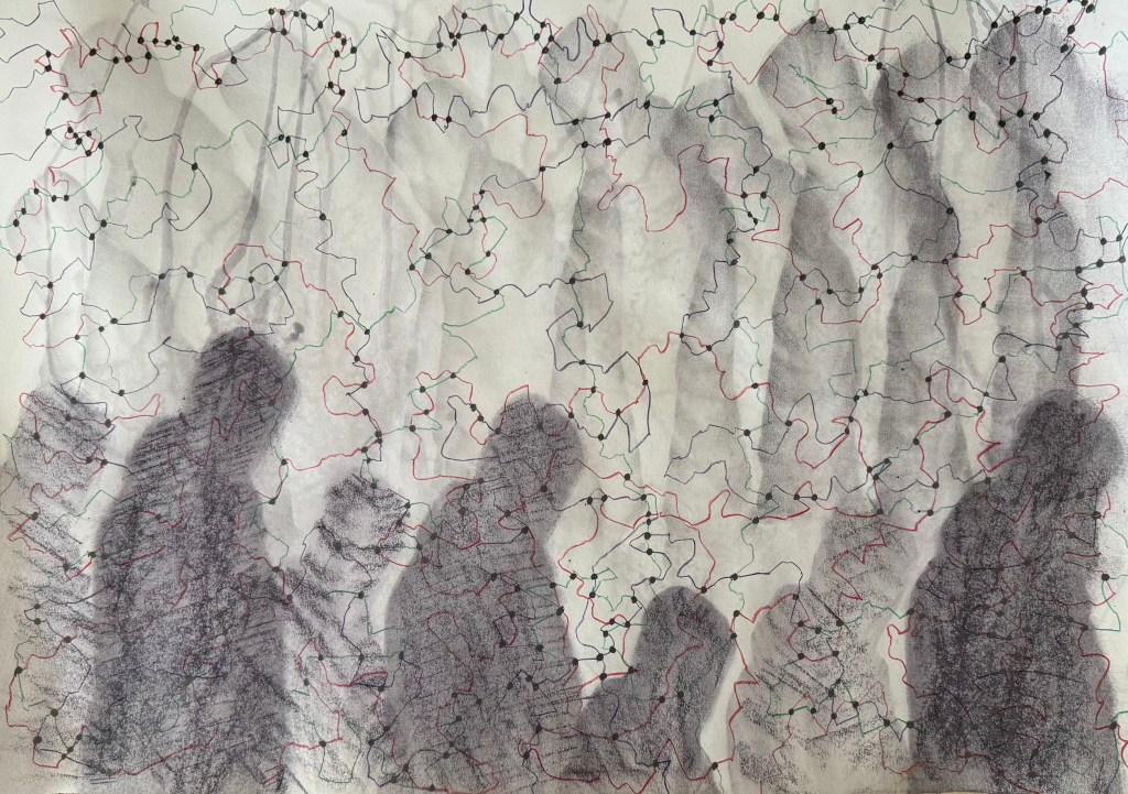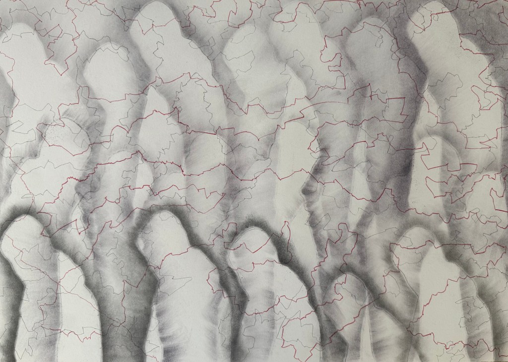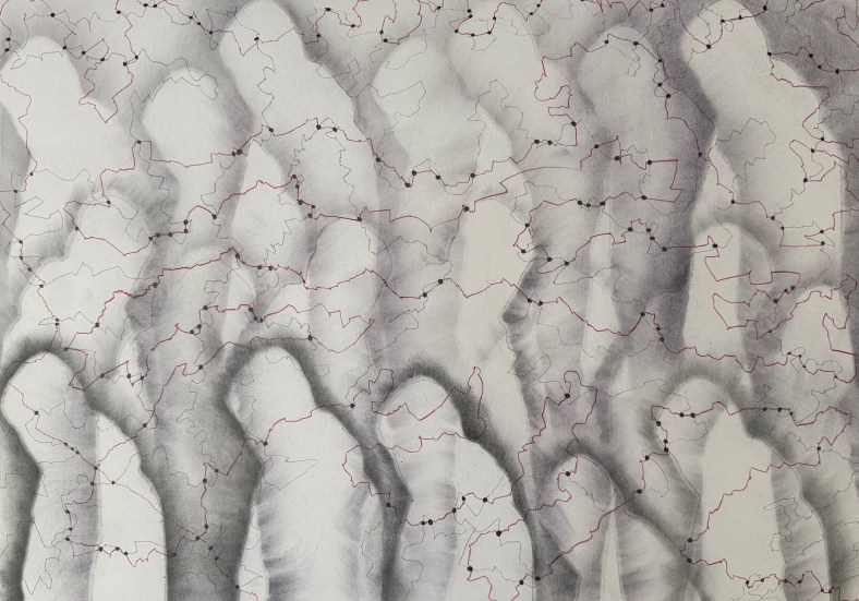 There seems to be a strong unintentional link to maps in the images: Cheng said that the images in which I’ve marked the intersections remind her of constellations, and Dalal observed that the lines themselves could be interpreted as borders, which then feeds into borders marking the the point where countries connect. This led to me seeing that the outline of the shapes themselves resemble coastlines.
