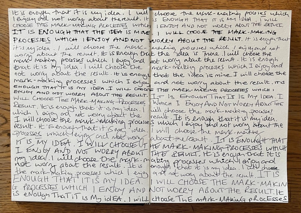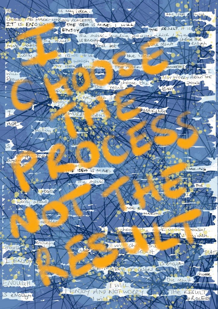 This feeds into my concern about the extent to which I can take credit for a work in which others have had an input, or in which chance has played a major part. I mentioned the possibility of having to engage the services of a professional printer to screen print on a mirror and referred to the Phyllida Barlow video in yesterday’s session; I saw an exhibition of Barlow’s work last year at Hauser + Wirth and watched the accompanying video documentary in which she had technicians assisting her. I also mentioned artists such as Damien Hirst who have a team of people who help make their work. I tell myself that it is enough that it is my idea, or that I created the particular circumstances in which chance created something. It is a mantra I keep repeating to myself, and I think that I am starting to accept it.