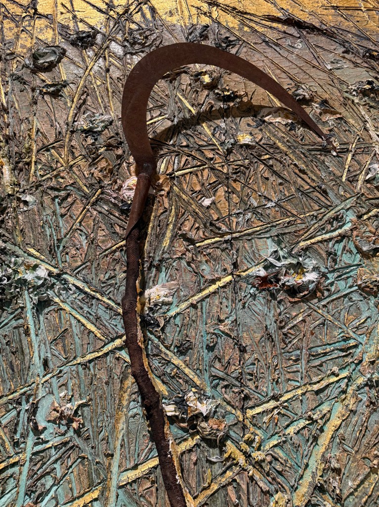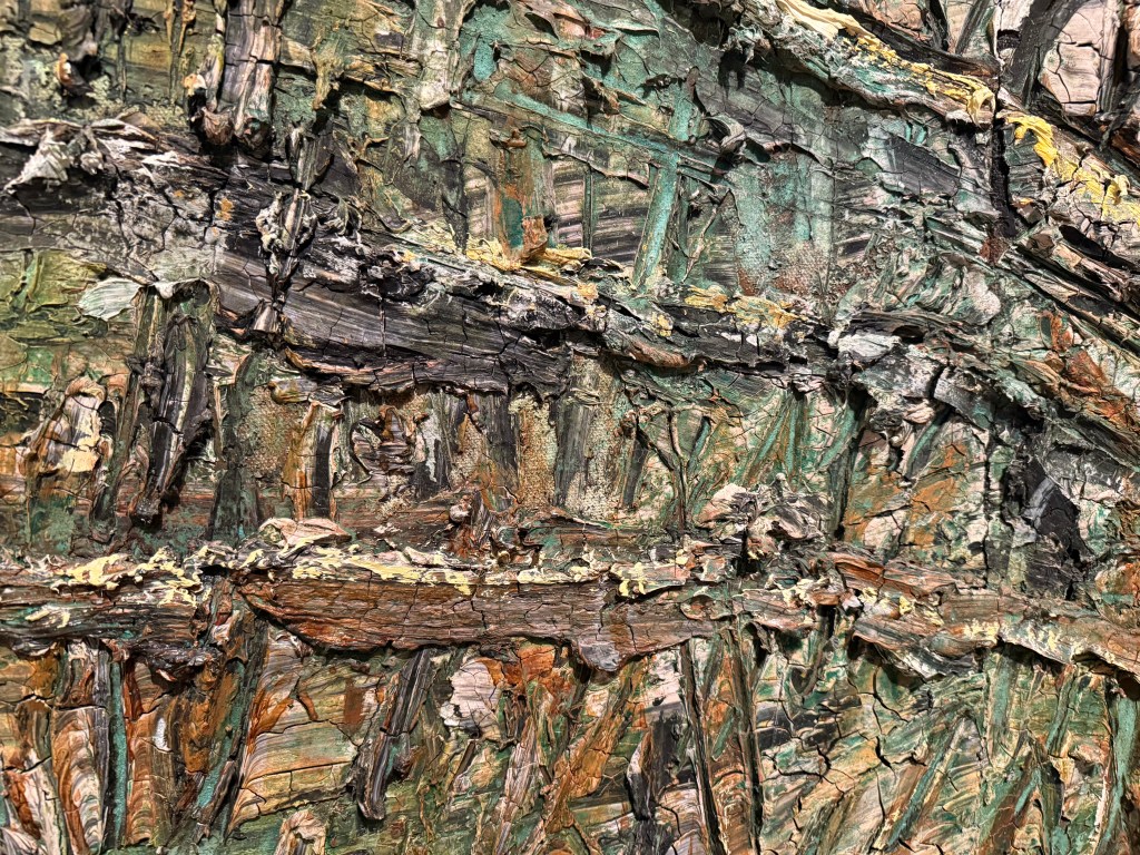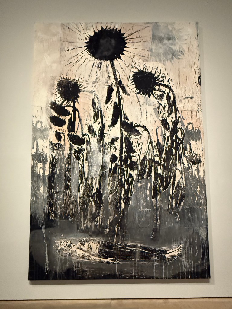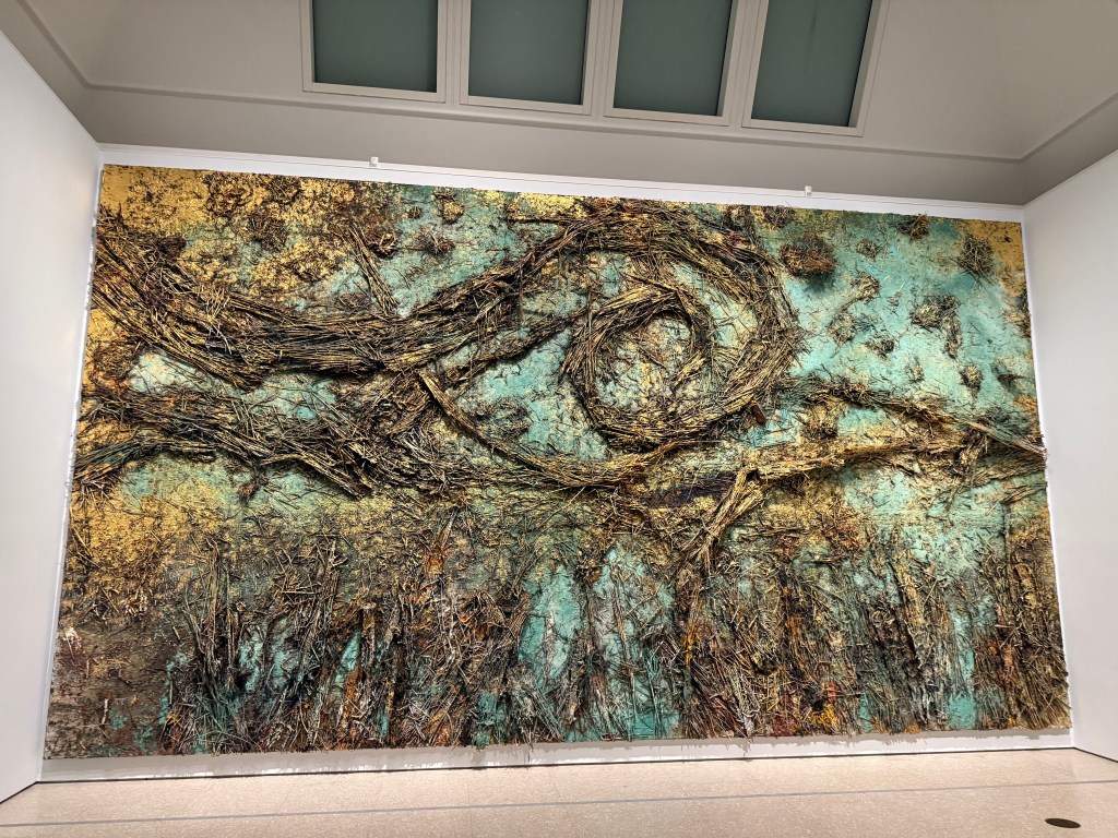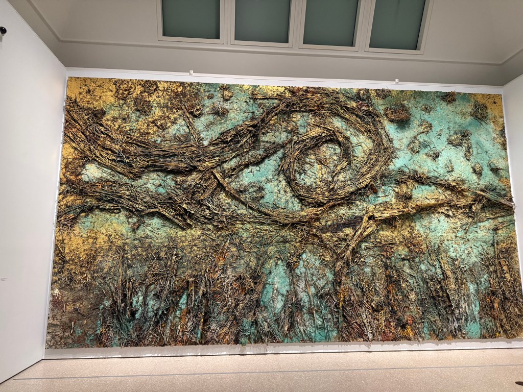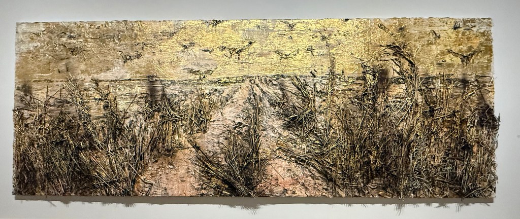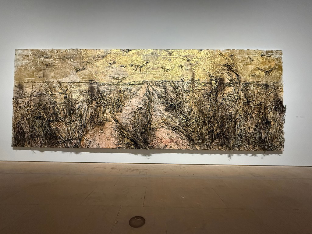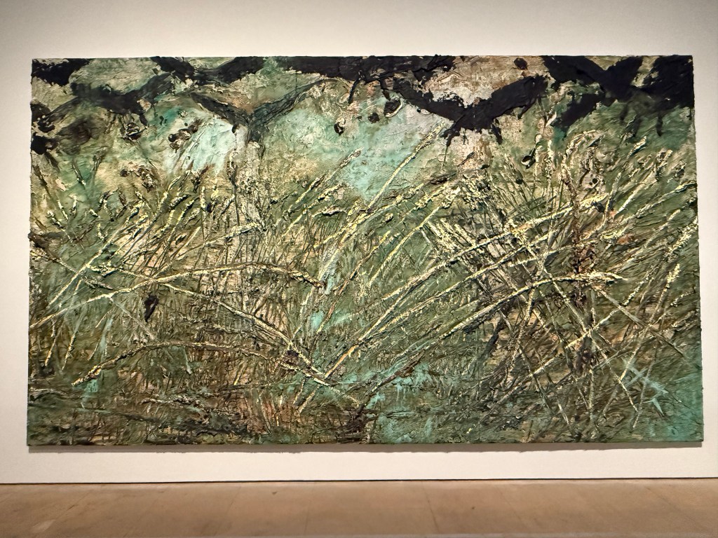 Then we went into the Kiefer/Van Gogh exhibition. I didn’t expect to enjoy it and I’m not sure that enjoy is the right word anyway. The works are huge and for once I didn’t really even register their size, because it was inherently obvious why they were the way they were. I sat in front of the first image below (Crows) for ages. In my mind the path leading up the centre was wet and muddy, the kind on which you can’t get any traction, putting in lots of effort but slipping and sliding all over the place and getting nowhere. Despite its warm colours, it felt bleak and desolate.