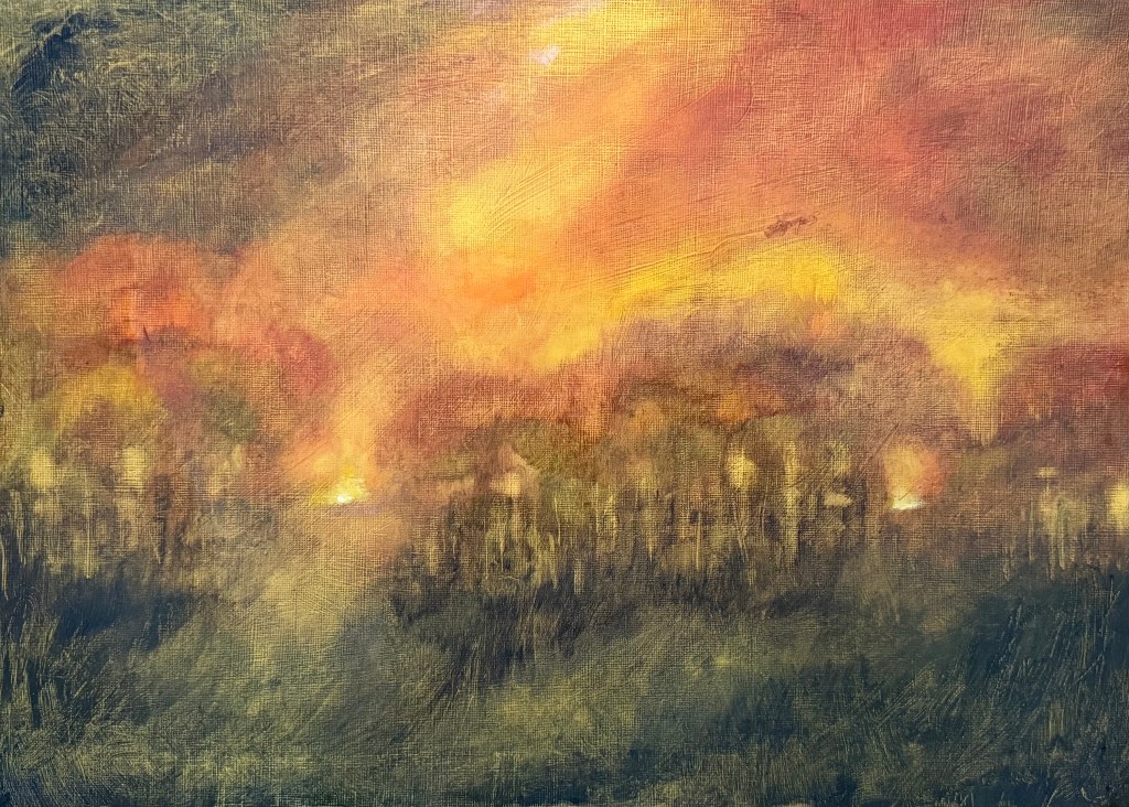 What do I think of it? As a study of an imaginary forest fire à la Turner, well, I think I’ve done ok. I’ve managed to create lots of layers and there is definitely some optical mixing going on. I think that I’ve managed to keep it quite loose (for me, anyway). I enjoyed putting the glazes on, colour was caught in the marks and grooves in lower layers which had been made when I had loosely put down the ground. I like that it was out of my control to a certain extent.