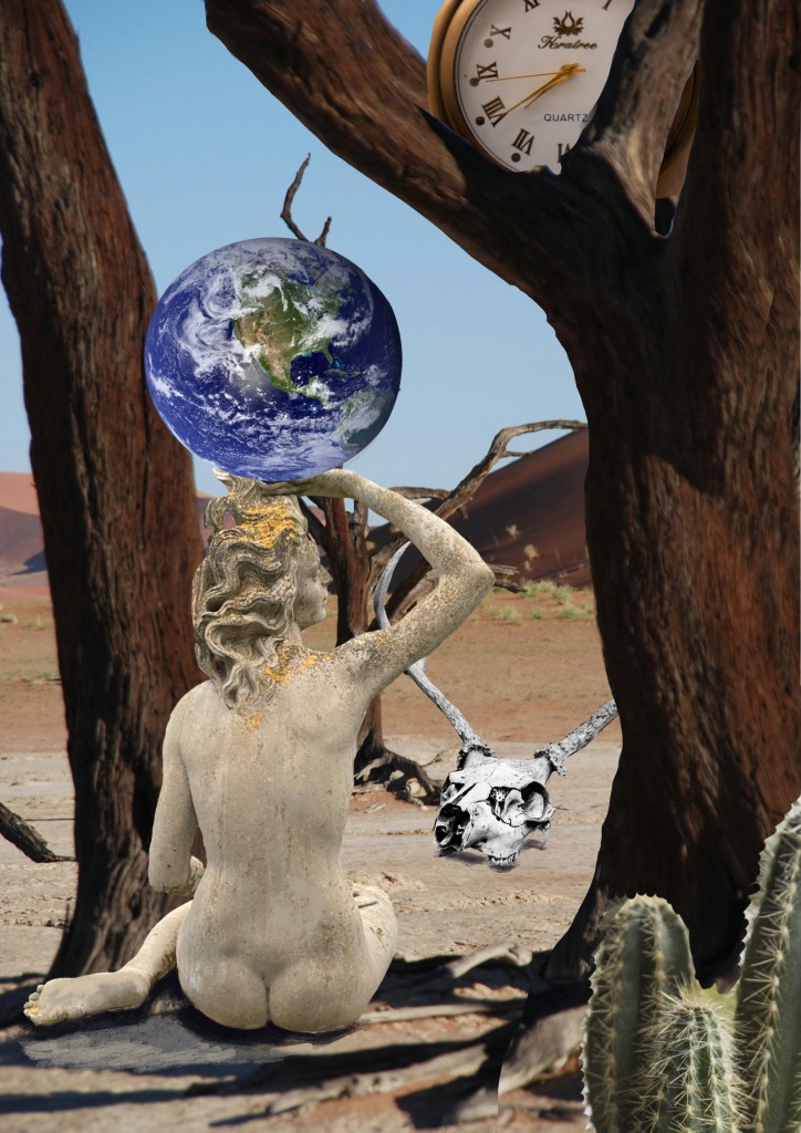 I’m quite pleased with it as a first attempt and I can see that there is a lot of potential in producing digital collages. I found the process quite frustrating at times, but that was mainly due to my incompetence and this will improve with practice, hopefully. Next time I will take a bit more care in selecting my images; I don’t think the cactus in the foreground works particularly well, but I just needed something to detract from the lack of clarity in the tree roots. I used the paintbrush option to put in a shadow under the skull, but the shadow of the figure doesn’t work at all – I was unable to alter it as I had merged several layers together by that stage. Going forward, I think I need to give more thought to the interaction of the layers and also, to save time, it would be a good idea to start to create a collection of images rather than searching through photos and websites on the hoof.